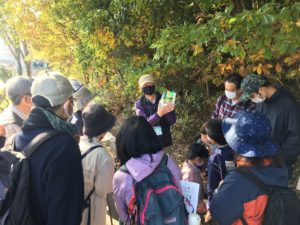どんぐりsとUR共催の「高森山で紅葉を見よう会」が20日開かれ、晴天にも恵まれ親子連れなど78人が参加。黄色や赤に色づいた散策路でガイドから植生の解説を聞きながら深まる秋を堪能した=写真。
